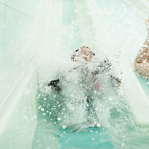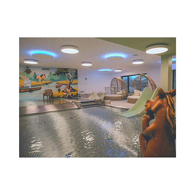 Tauchen Sie ein in unsere bezaubernde Wasserwelt mit einem lichtdurchfluteten Hallenbad, das Sie direkt ins Freie führt. Für aufregende Momente sorgen die Trioslide und die Röhrenrutsche – perfekt für Kinder und Jugendliche, die Action lieben.
