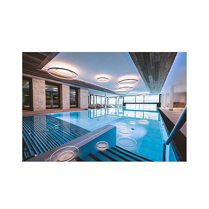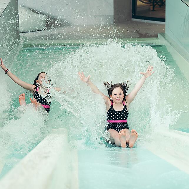 Ob Nervenkitzel oder entspanntes Planschen – unser Wasserspielpark bietet Urlaubsspaß für Groß und Klein. Während Sie entspannen, eröffnen großflächige Glasfronten den Blick auf die malerische Landschaft des Salzburger Landes.
