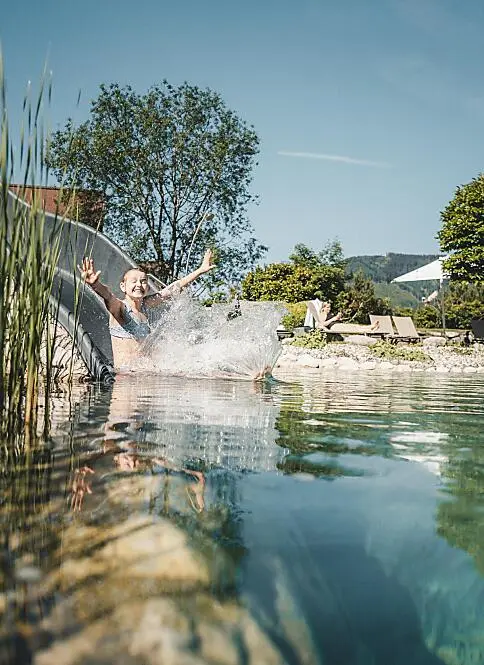 Ob Nervenkitzel oder entspanntes Planschen – unser Wasserspielpark bietet Urlaubsspaß für Groß und Klein. Während Sie entspannen, eröffnen großflächige Glasfronten den Blick auf die malerische Landschaft des Salzburger Landes.