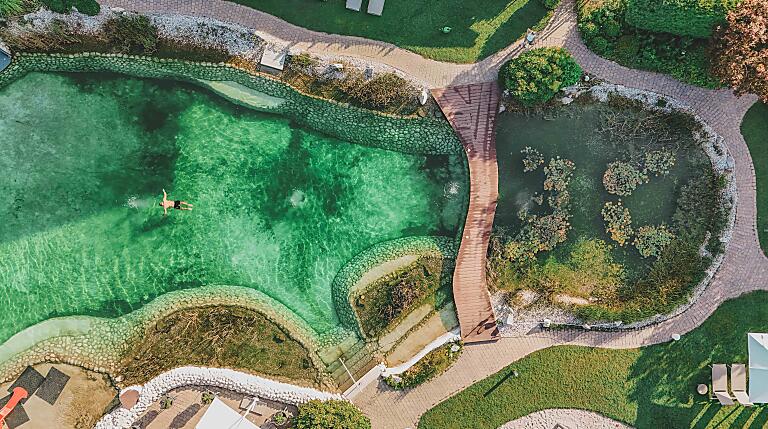 Gemütliche Bahnen ziehen, die zwei Wasserrutschen hinuntersausen oder einfach nur auf dem Steg sitzen, die Füße im Wasser baumeln lassen und am Eis schlecken. Unser Naturbadeteich ist das Herzstück des Hauses und absolutes Highlight im Sommer. Eine Besonderheit! Mit seinem Kleinkindbereich lädt er Groß und Klein zum ausgiebigen Planschen ein.